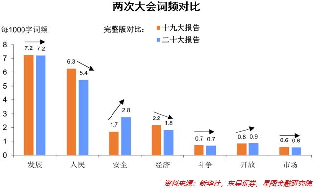 对比两次大会的词频,可以看到“安全”有了明显提升,侧面印证了高层对于国家安全的重视程度。
