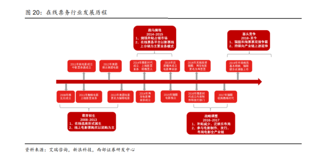 猫眼和淘票票分别为腾讯与阿里票务领域的两大布局,背后是腾讯系和阿里系大文娱流量与资源的比拼。西部证券研报指出,头部互联网集团分别为猫眼与淘票票提供强大的流量优势,淘票票背靠阿里,流量入口主要是淘宝、支付宝、大麦、口碑、微博、高德等平台;腾讯也为猫眼提供了微信和 QQ 两大流量入口。依托腾讯系与阿里系的大文娱资源,猫眼与淘票票均从在线票务切入内容制作、宣传、发等业务,布局全产业链。