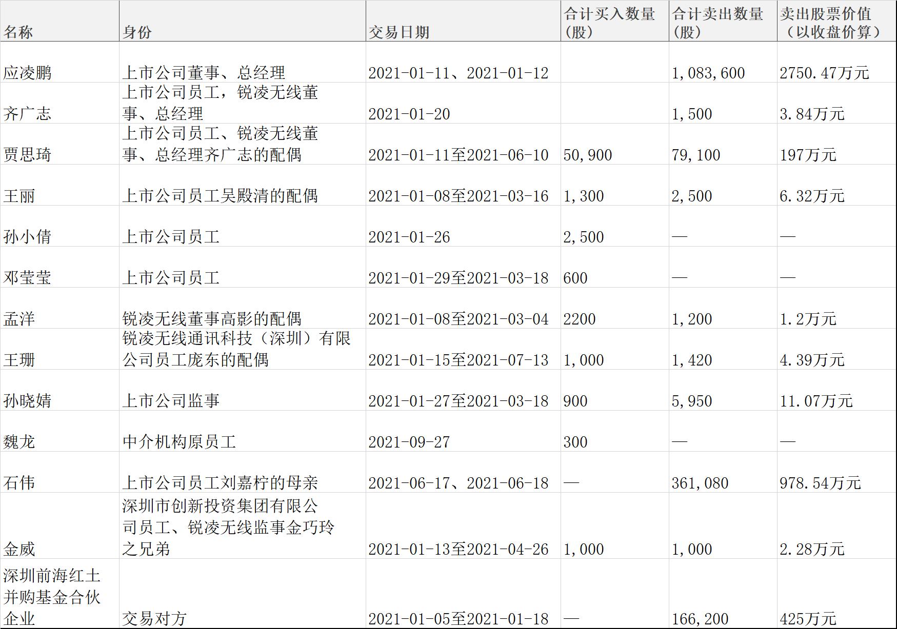 本次谋划重大资产重组期间,广和通有包括公司董监高在内的13名相关人员及相关机构存在交易公司股票的行为。其中,交易数量最多的前三名自然人分别累计交易了108.36万股、36.11万股和13万股。分别是广和通董事及总经理应凌鹏、广和通员工刘嘉柠的母亲石伟以及广和通员工、锐凌无线董事、总经理齐广志的配偶贾思琦。从交易日期来看,多发生在1月18日前后。