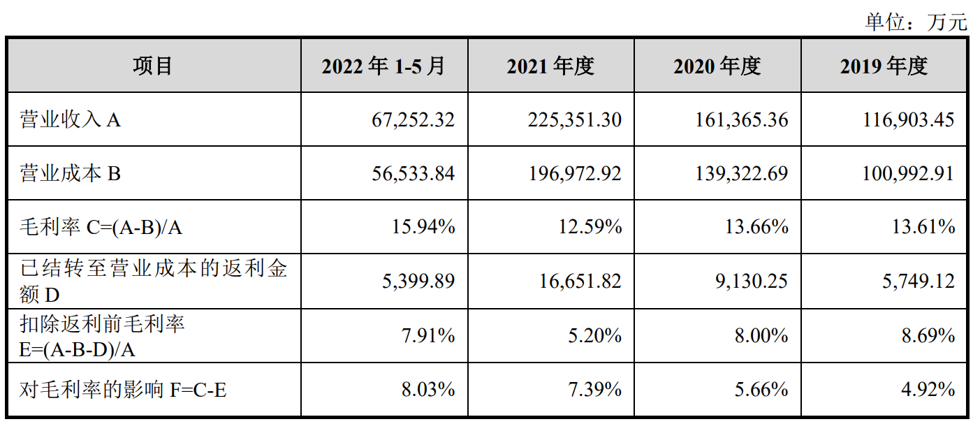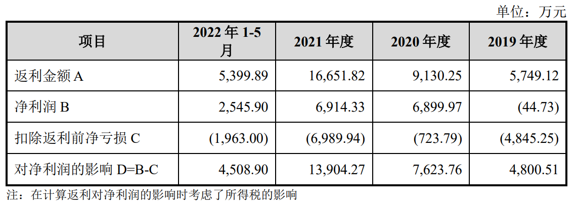 不过,2019年和2020年净利润出现差异的原因更可能是公司的经营模式导致。据悉,锐凌无线车载无线通信模组生产时,基带芯片需要从高通采购。其生产的模组产品在实现销售后,针对特定型号的芯片,高通按照约定支付给锐凌无线一定的返利金额或者签发可以抵扣采购货款的返利确认单。2019年-2021年度以及2022年1-5月,锐凌无线从高通获得的返利金额分别为5749.12万元、9130.25万元、1.67亿元以及5399.89万元。