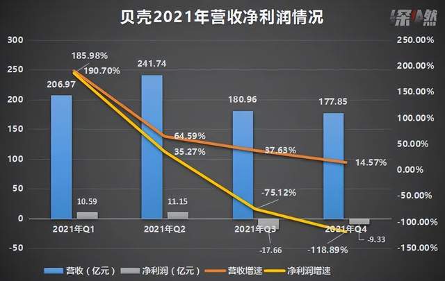 分开来看,2021年第一季度和第二季度,贝壳的营收、净利润和增速均表现尚可。一季度,公司营收206.97亿元,净利润10.59亿元;二季度营收241.74亿元,净利润11.15亿元;到了第三季度,营收下降为180.96亿元,净亏损17.66亿元,第四季度,营收进一步降至177.9亿元,净亏损为9.33亿元。