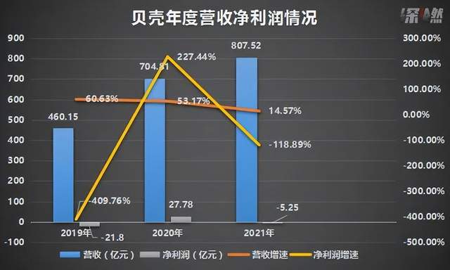 最新招股书显示,过去的2019年、2020年和2021年,贝壳分别实现营收460.01亿、704.81亿和807.52亿元,净亏损分别为21.80亿、27.78亿和5.25亿元。经调整后,净利润分别为7.75亿、50.31亿和10.14亿元。