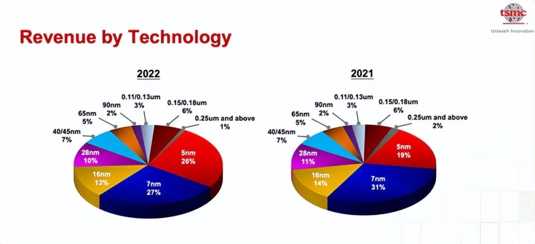 分制程工艺来看,第四季度台积电5nm占比32%,7nm占比22%,合计占比达到54%。全年来看,相比2021年,7nm收入占比下降4个百分点,5nm收入占比从19%增至26%。