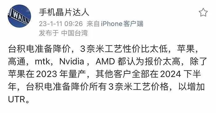 但另据“手机晶片达人”发布的微博,台积电准备降低所有3nm工艺价格,各大客户均认为报价太高。苹果的将在2023年量产,其他客户的则全部在2024年下半年。