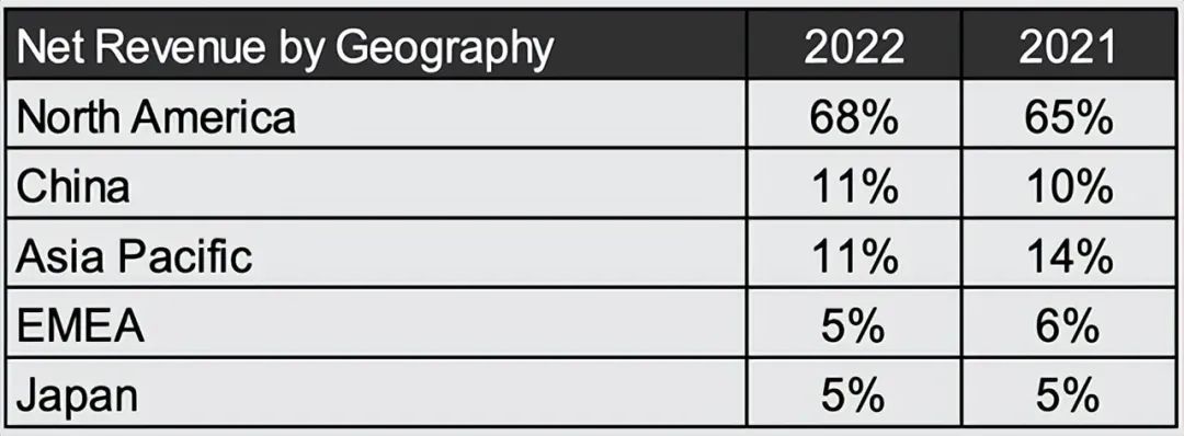 从营收分布上看,2022年台积电营收有68%来自于美国的,高于2021年的65%。其它地区只有中国大陆增加了1%,余者都有所减少。