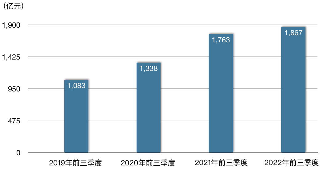 利润上,医药生物企业的净利润从2019年前三季度的1,083亿元逐步增至2022年前三季度的1,867亿元,增长了72%。同期净利润增幅是营收的约2倍(见表三)。