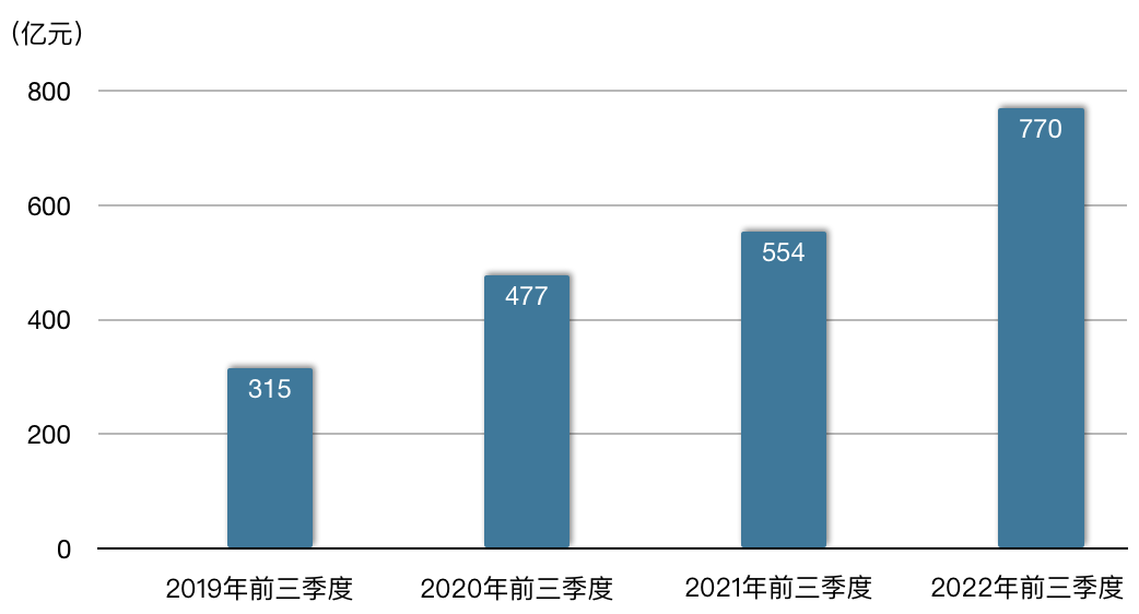 营收上,2019年前三季度的总营收为13,516亿元,随后3年持续增长,到2022年前三季度达到18,409亿元,较2019年增长了36%(见表二)。此外,除去2019年前三季度还未上市的企业,2022年前三季度有304家企业的营收较2019年实现正增长、103家为负增长。