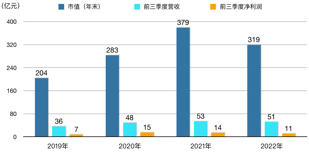 迈瑞医疗成立于1991年,主营业务为医疗器械,是目前A股医药生物类市值最高的公司,2022年末市值为3,831亿元。受益于抗体检测试剂和IVD化学发光仪器的热卖,迈瑞医疗在2020年前三季度,市值一度逼近5,000亿元。从2019年前三季度到2022年前三季度,迈瑞医疗的营收和净利润一直有所提升,但市值已从高点缩水1000多亿元。