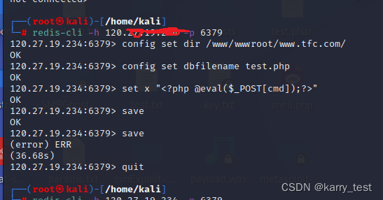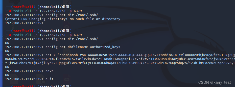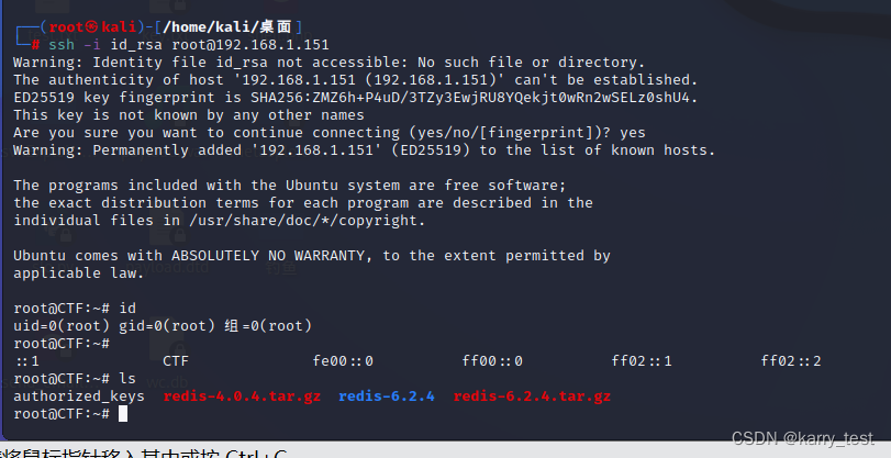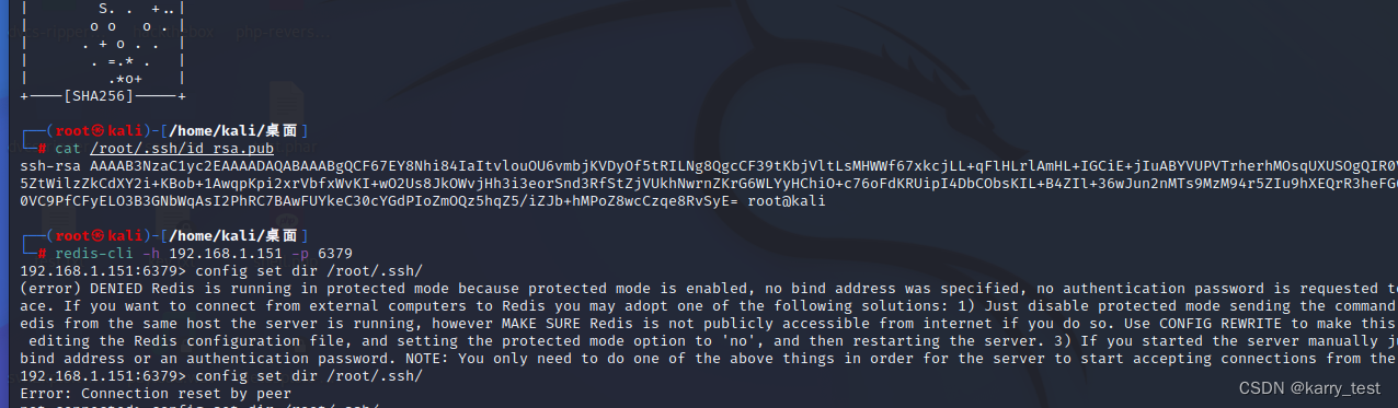 2.4设置Redis的备份路径为/root/.ssh/和保存文件名为authorized_keys,并将kali生成的ssh公钥数据保存在目标服务器硬盘上路径为/root/.ssh/里面,因此我们可以通过kali的ssh私钥连接目标主机
