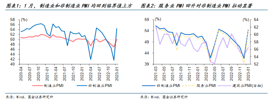 从主要经济指标看,首先是1月制造业采购经理指数(PMI)为50.1%,高于上月3.1个百分点,为2020年3月以来最大环比升幅;非制造业PMI和综合PMI产出指数分别为54.4%、52.9%,高于上月12.8和10.3个百分点。