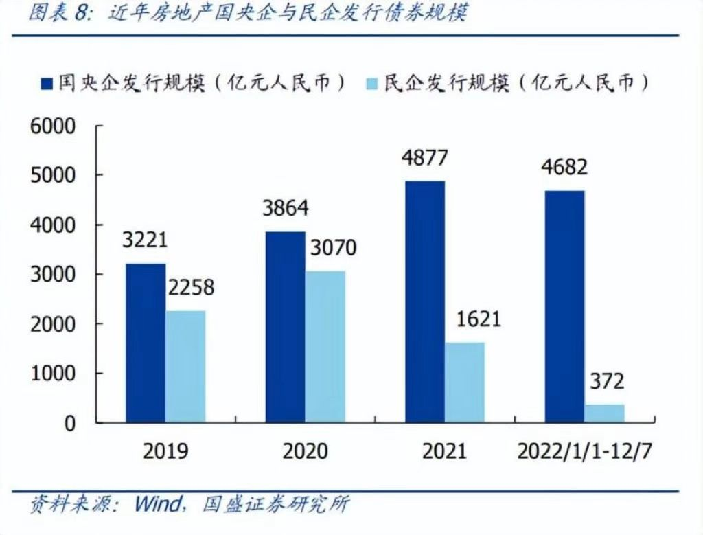 值得一提的是,2022年国央企累计发债 4682 亿元,民企发行372 亿元。这意味着除极少数优质民企外,绝大部分民企的债券融资渠道已近停滞。