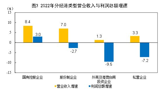 国家统计局数据显示,2022年,全国规上工业企业利润总额比上年下降4.0%,其中私营企业利润总额同比下降7.2%。