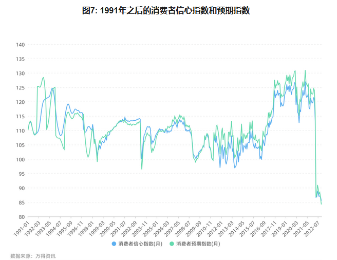 且在2022年以前,就业预期始终高于收入预期,现在就业预期下降到收入预期之下,体现了消费者失业忧虑大幅上升。