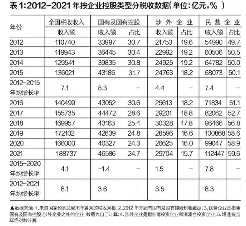 2021年,民营经济税收占比为59.6%,民营企业占市场主体96%。2012-2021年,民营企业税收总额年均增长率达到8.3%,是所有类型企业里增速最快的。