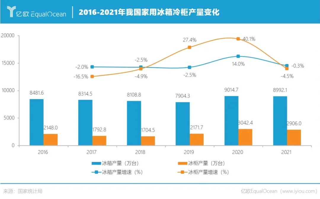 其实自疫情以来,家用冰柜和冰箱的销量都有明显增长,其中冰柜的增幅尤为显著。国家统计局数据显示,2020年冰箱产量为9014.7万台,同比增长14.0%;冷柜产量为3042.4万台,同比增长更是达到40.1%。