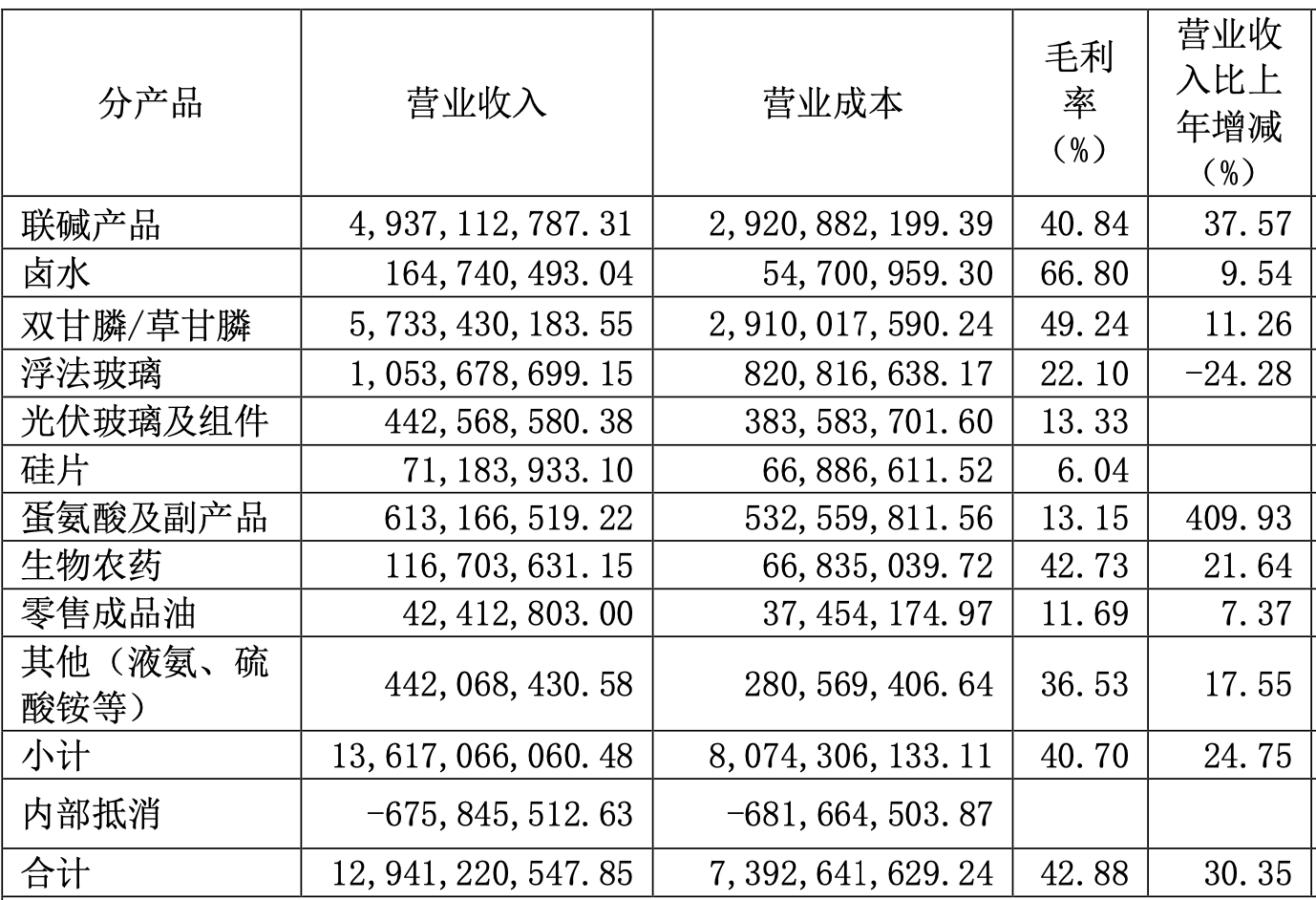 价格给力,产销两旺,和邦生物化工产品贡献的业绩自然可观。年报披露,去年公司联碱产品、卤水、双甘膦/草甘膦分别贡献收入49.37亿元、1.65亿元、57.33亿元,同比增长37.57%、9.54%、11.26%;毛利率分别录得40.84%、66.80%和49.24%,均实现不同程度的增长。