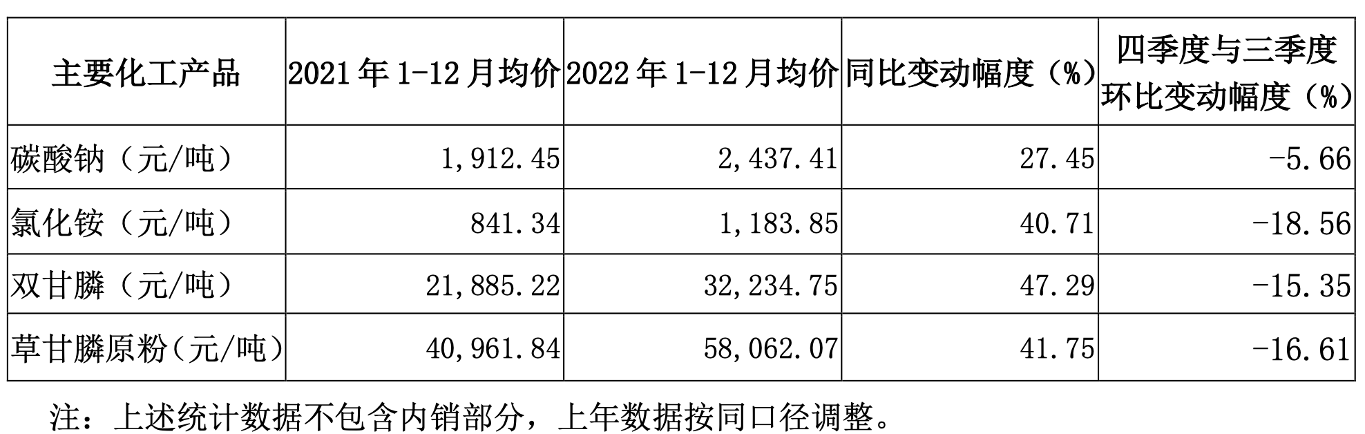 业绩增长,主要得益于主营产品纯碱、双甘膦/草甘膦等产品平均销售价格同比上涨。经营数据显示,尽管去年四季度价格环比有所下滑,但全年均价依然较2021年大幅增长。