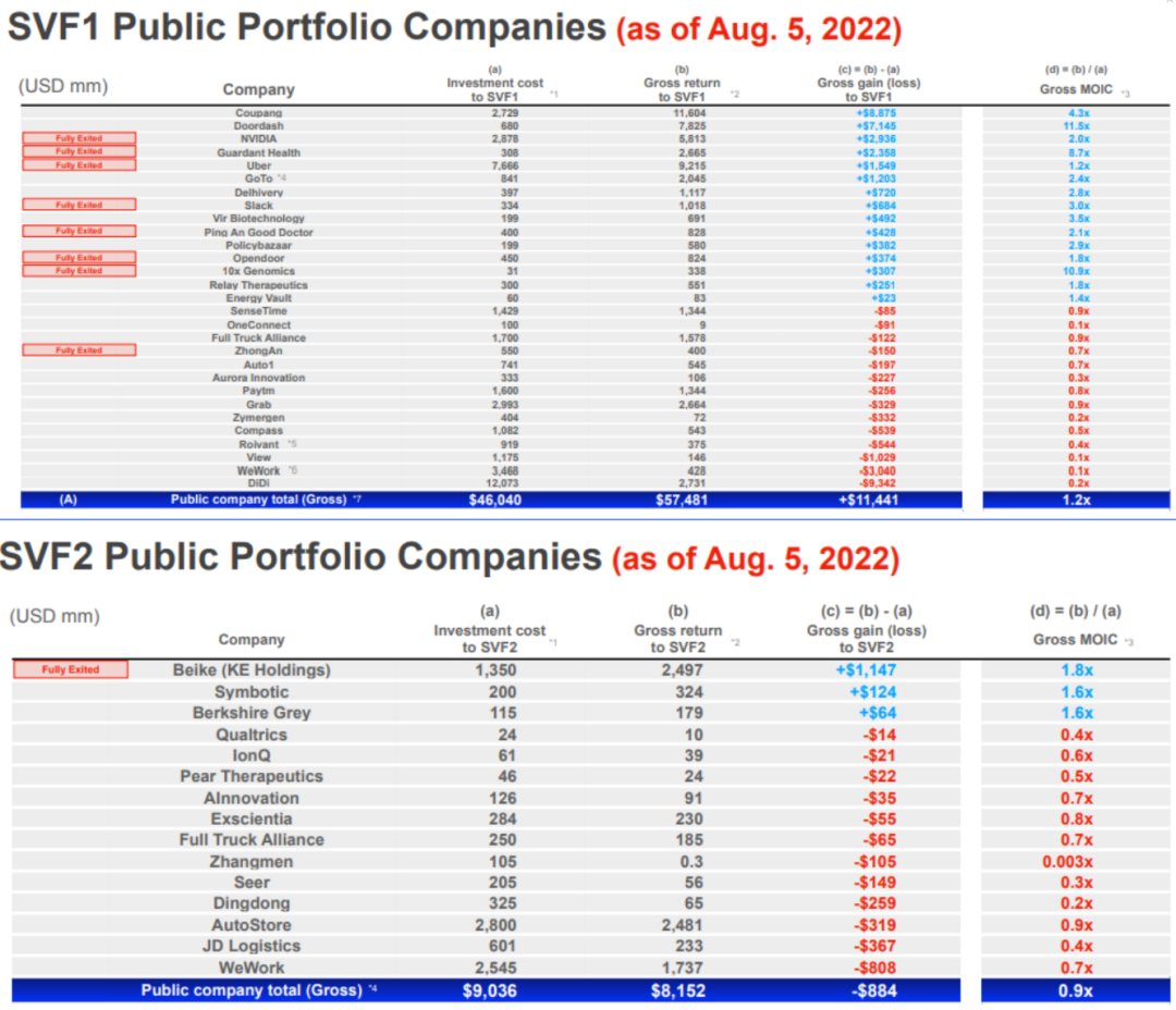 然而即便像二期这样广撒网,也再难捞上像一期那样的大鱼了。以软银在披露文件里挑选的已上市投资对象为例,可以看出一期的投资组合赚和亏的各一半,赚的也基本都完全退出了,二期的却基本全都在亏,而且还未完全退出: