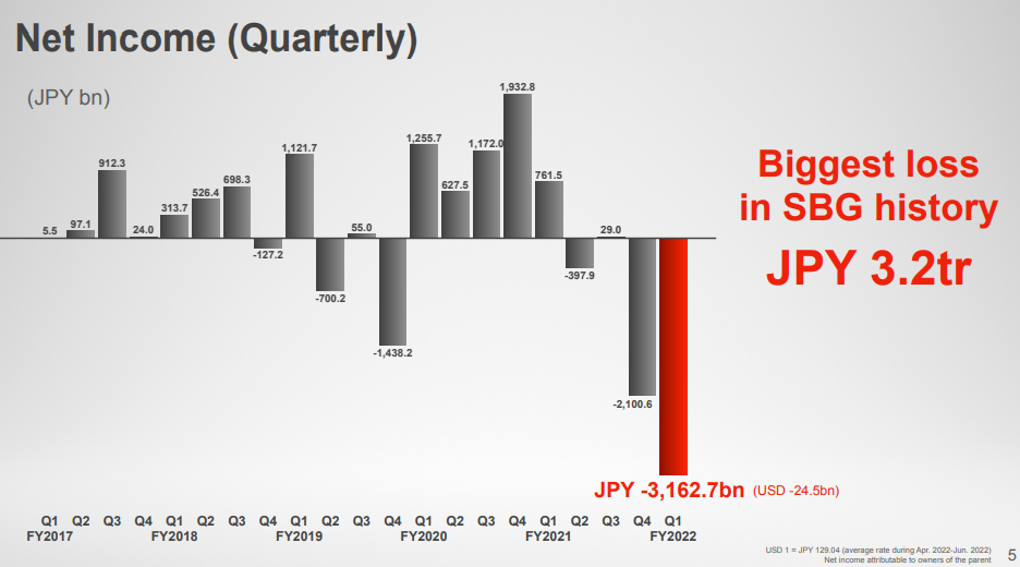 财报文件显示,软银集团在本季度录得约3.2万亿日元(文件内标注约合245亿美元)净亏损,仅用三个月的时间,就打破了上季度刚刚创下的最大单季亏损纪录。