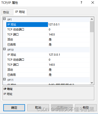 将IP1和IP10的【IP地址】设为127.0.0.1,并将所有【IP+数字】的【已启用】设为是。接着,拖动下拉条到最下方,将IP1、IP10、 IPAll 中的【TCP端口】设成 1433。