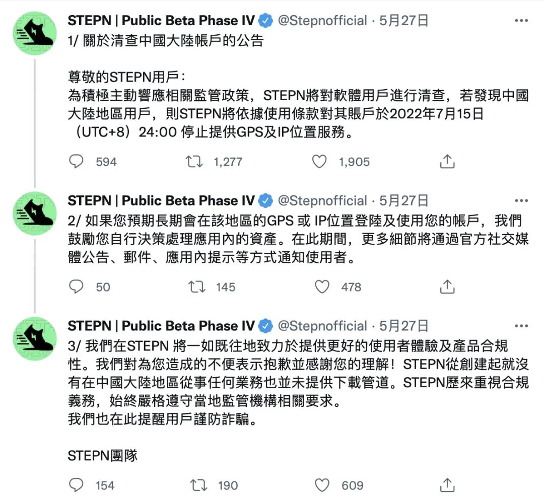 STEPN 官方发布《关于清查中国大陆账户的公告》。图片来源 | STEPN twitter 账号截图