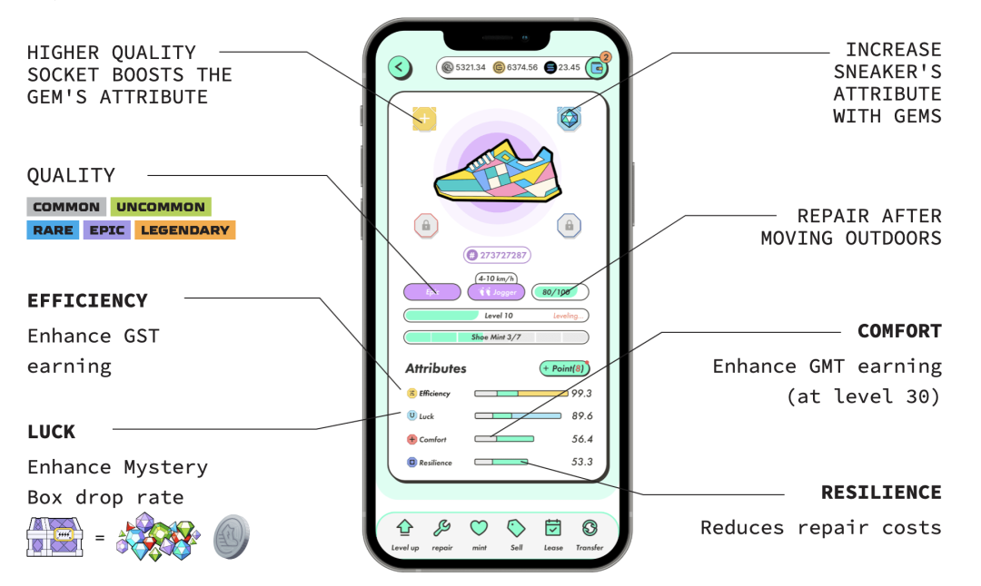 赚钱的多少取决于用户的运动情况和鞋子因素。鞋子有不同的属性、类型、品质、等级,用户根据不同鞋子对应的配速区间,在有效的能量时间范围内跑步,可以赚到无限增发的游戏代币 GST,用来升级运动鞋和宝石,解锁插槽,铸造新鞋,或者直接兑换成稳定币。