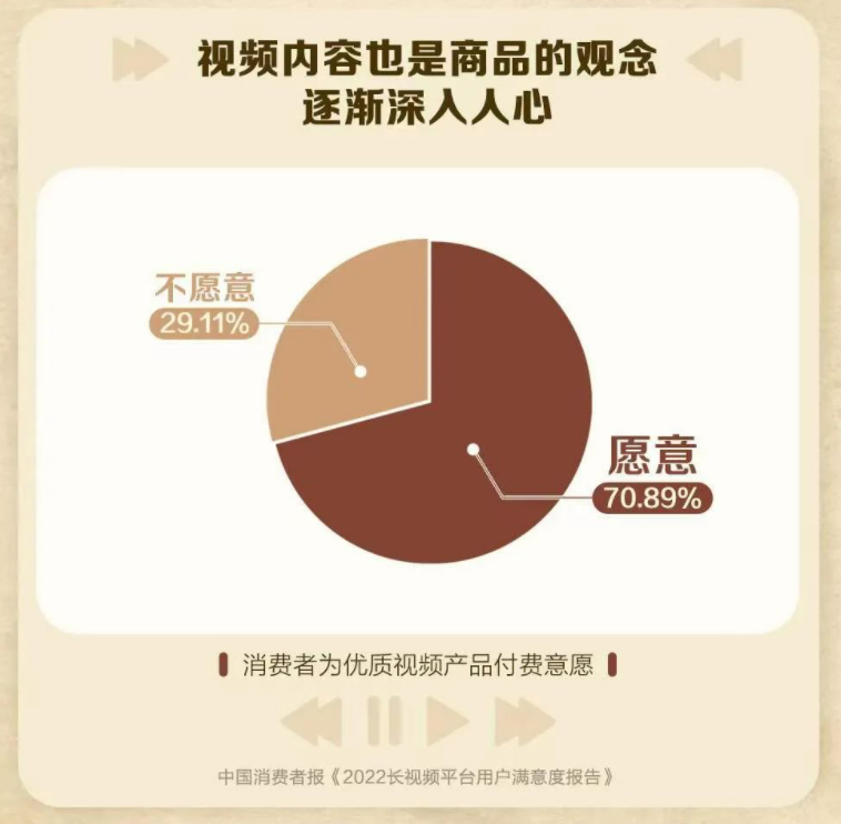 《中国消费者报》在《2022长视频平台用户满意度报告》指出,70%以上用户愿意为优质内容买单;在提前告知用户规则的前提下,59.14%的用户希望平台能够分层级付费,消费需求呈现细分趋势;有近60%的用户表示愿意为直播、番外、彩蛋等喜爱的IP衍生内容付费。