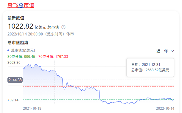 增长神话破灭,直接招来资本市场的恐慌情绪。Q1财报发布后,奈飞市值一度腰斩,跌去数百亿美金。目前市值回升至1033.98亿美元,仍与2021年底的2668.52亿美元相差甚远。