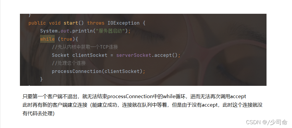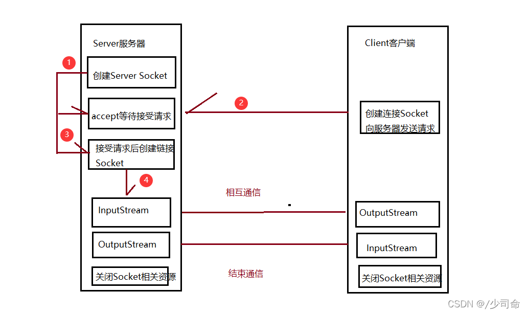 方法签名方法说明Socket accept()开始监听指定端口(创建时绑定的端口),有客户端连接后,返回一个服务端Socket 对象,并基于该Socket建立与客户端的连接,否则阻塞等待void close()关闭此套接字