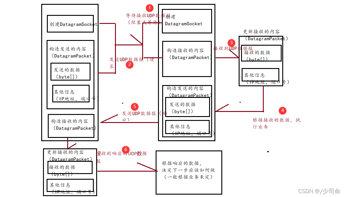 方法签名方法说明DatagramPacket(byte[] buf, int length)构造一个DatagramPacket以用来接收数据报,接收的数据保存在 字节数组(第一个参数buf)中,接收指定长度(第二个参数 length)DatagramPacket(byte[] buf, int offset, int length, SocketAddress address)构造一个DatagramPacket以用来发送数据报,发送的数据为字节 数组(第一个参数buf)中,从0到指定长度(第二个参数 length)。address指定目的主机的IP和端口号