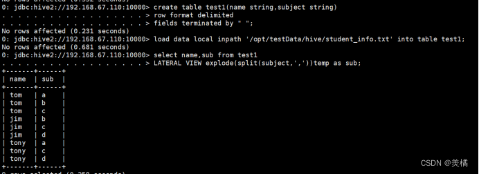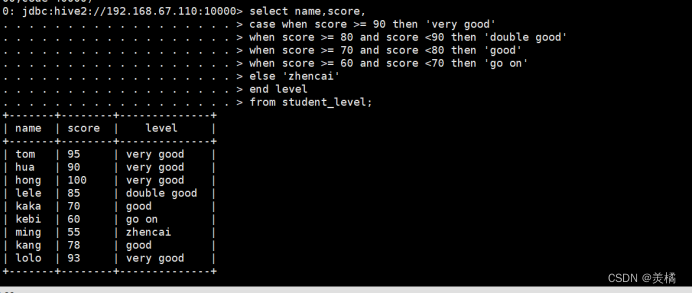 代码:0: jdbc:hive2://192.168.67.110:10000> select subject,sum(score)