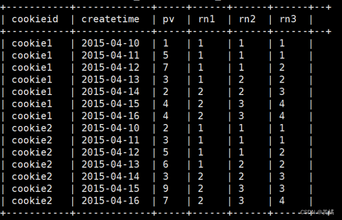 row_number() over (partition by cookieid order by createtime) as rn,