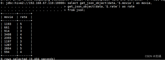 代码:select get_json_object(data,'$.movie') as movie,