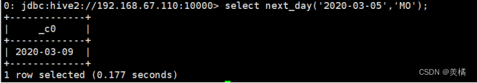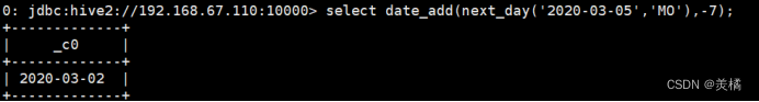 代码:select date_add(next_day('2020-03-05','MO'),-7);