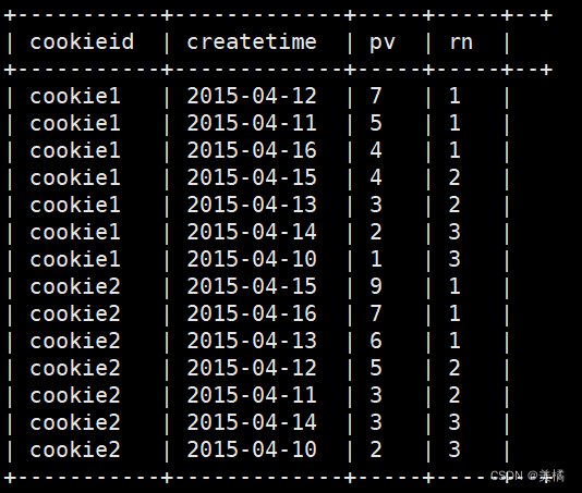 rank() over(partition by cookieid order by pv desc) as rn2