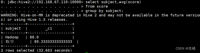 代码:0: jdbc:hive2://192.168.67.110:10000> select subject,avg(score)