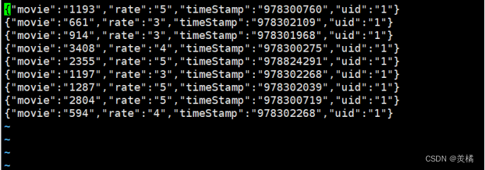 {"movie":"2804","rate":"5","timeStamp":"978300719","uid":"1"}