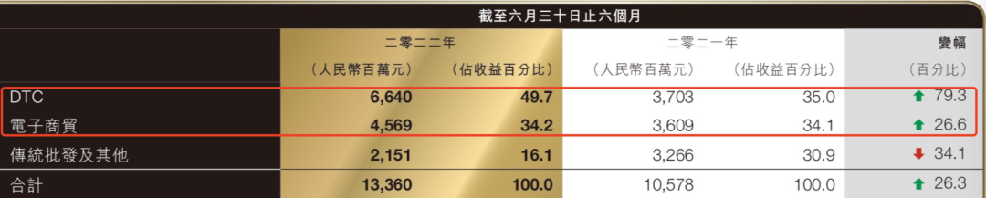 为持续优化线下门店,抵御FILA下滑带来的负面影响,从2020年起,安踏开始进行DTC转型,该模式核心在于将经销商门店转变为直营门店。到2022年上半年,来自DTC的收入为66.4亿元,同比增长79.3%。