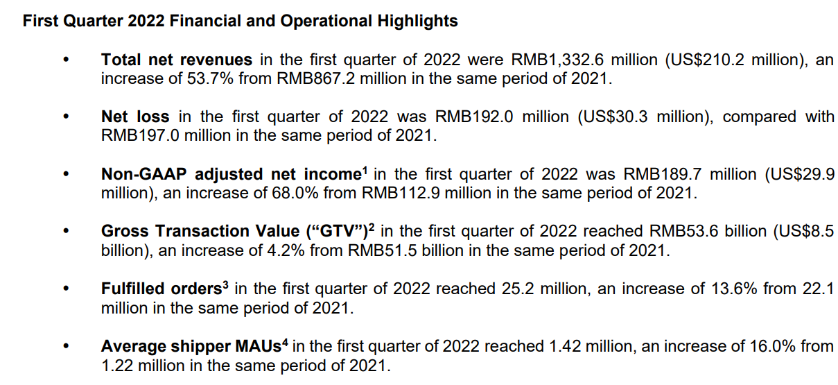 6月8日,满帮集团发布了截至2022年3月31日第一季度未经审计的财务业绩。