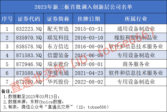 近日,2023年新三板首批调入创新层公司名单新鲜出炉。全国股转公司在2023年第一次创新层进层决定公告中披露,东方信达、华夏电通、华兴股份等7家新三板基础层公司调入创新层。