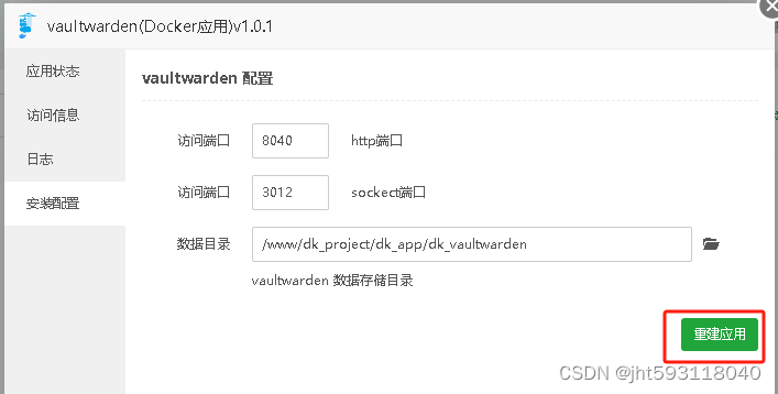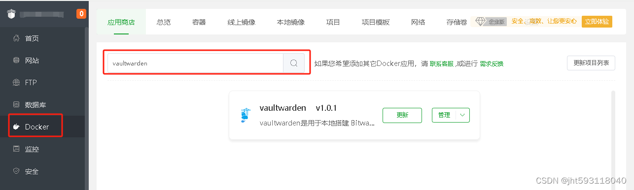 进入宝塔面板docker管理器,搜索vaultwarden,点击安装-立即安装