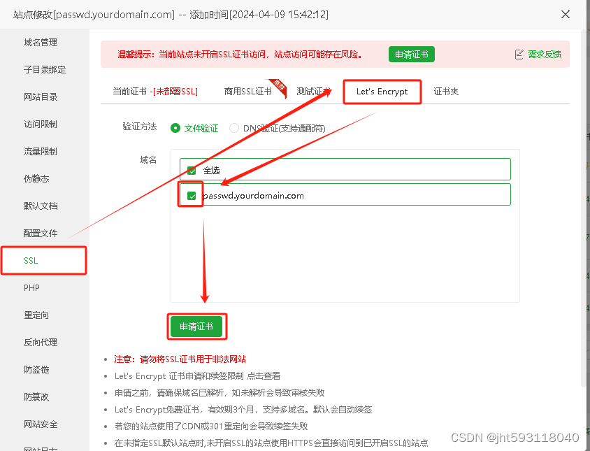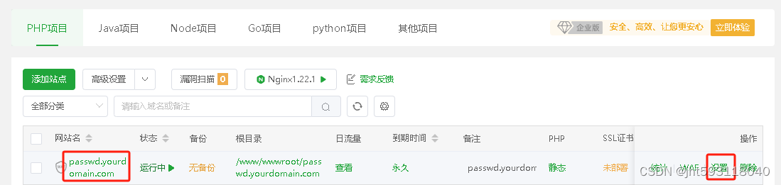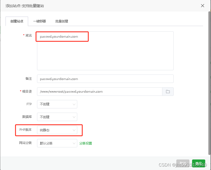 网站-添加站点:域名填写访问域名,可以是新建的二级域名,此处以passwd.yourdomain.com为例,PHP版本选择“纯静态”,点击确定。