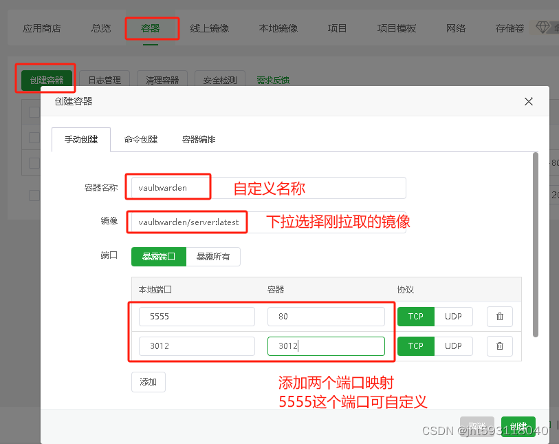 安装完成后,选择”容器“-”创建容器“,填写名称,下拉选择vaultwarden镜像,添加80、3012两个端口映射,点击创建。