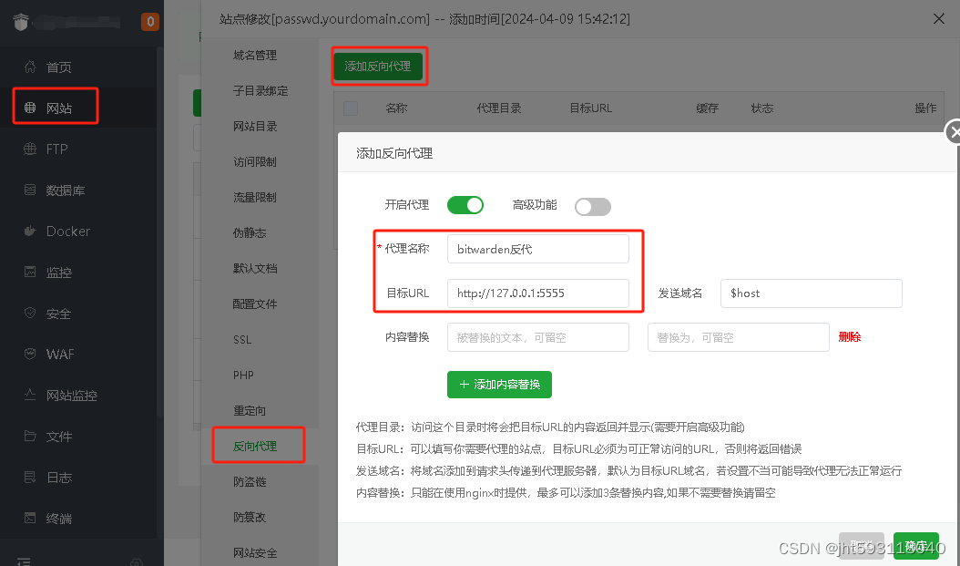 回到站点管理,进入passwd.yourdomain.con站点设置,选择反向代理,添加反向代理,填写代理名称,目标URL中填写”http://127.0.0.1:5555(同上方自定义端口,如有修改,请保持一致),确定退出。
