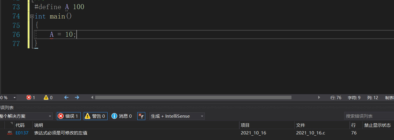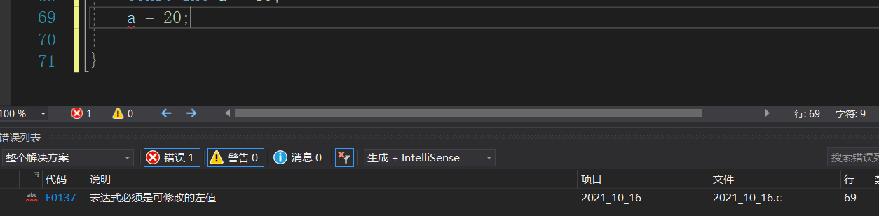 由此可以得到,#define修饰的是不可修改的常量(第一个图可以看出不可修改,图二可以看出是常量,至于具体的原因,以后#宏定义为何会这样,以后有机会会给大家作出相应的解释,目前大家先记住即可。