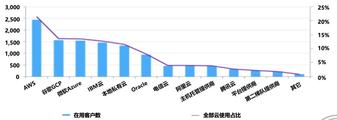 重资产投入、高技术应用的公有云领域,聚集效应明显,市场逐渐由超大规模云提供商主导,头部的亚马逊AWS、谷歌GCP、微软Azure、IBM 云占全球云使用量的61%以上,亚马逊AWS成为全球最受欢迎的云商。