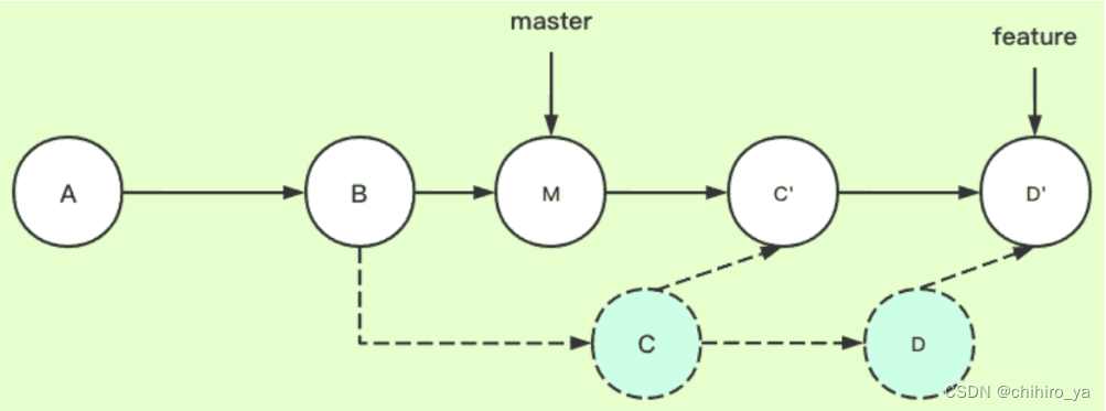当在feature分支上执行git rebase master时,git会从master和feature的共同祖先B开始提取feature分支上的修改,也就是C和D两个提交,提取到,然后将feature分支指向master分支的最新提交上,也就是M,最后把提取到的C和D接到M后面(依次拿M和C、D内容分别比较,处理冲突后生成新的C'和D')
