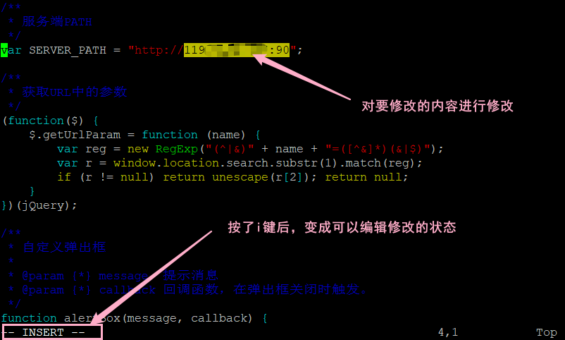 定位到要修改的位置后按 i键变成可编辑状态,对要修改的内容进行修改