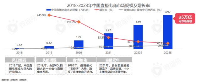 机构预计,伴随我国经济的不断发展、消费需求的不断旺盛、网络基建的普及,越来越多消费者通过直播电商了解产品、购买产品,2023年我国直播电商市场将达到4.92万亿元。