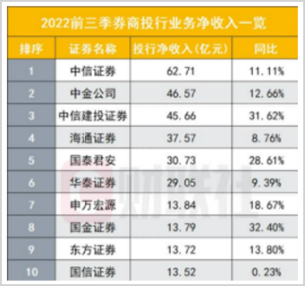 过去一年的券业寒冬中,有一项业务板块仍出现较强发展韧性,即服务于B端用户上市融资需求的投行业务。2022年前三季度,41家可比数据券商实现投行业务净收入总计为429.98亿元,同比逆势增长了5.35%。